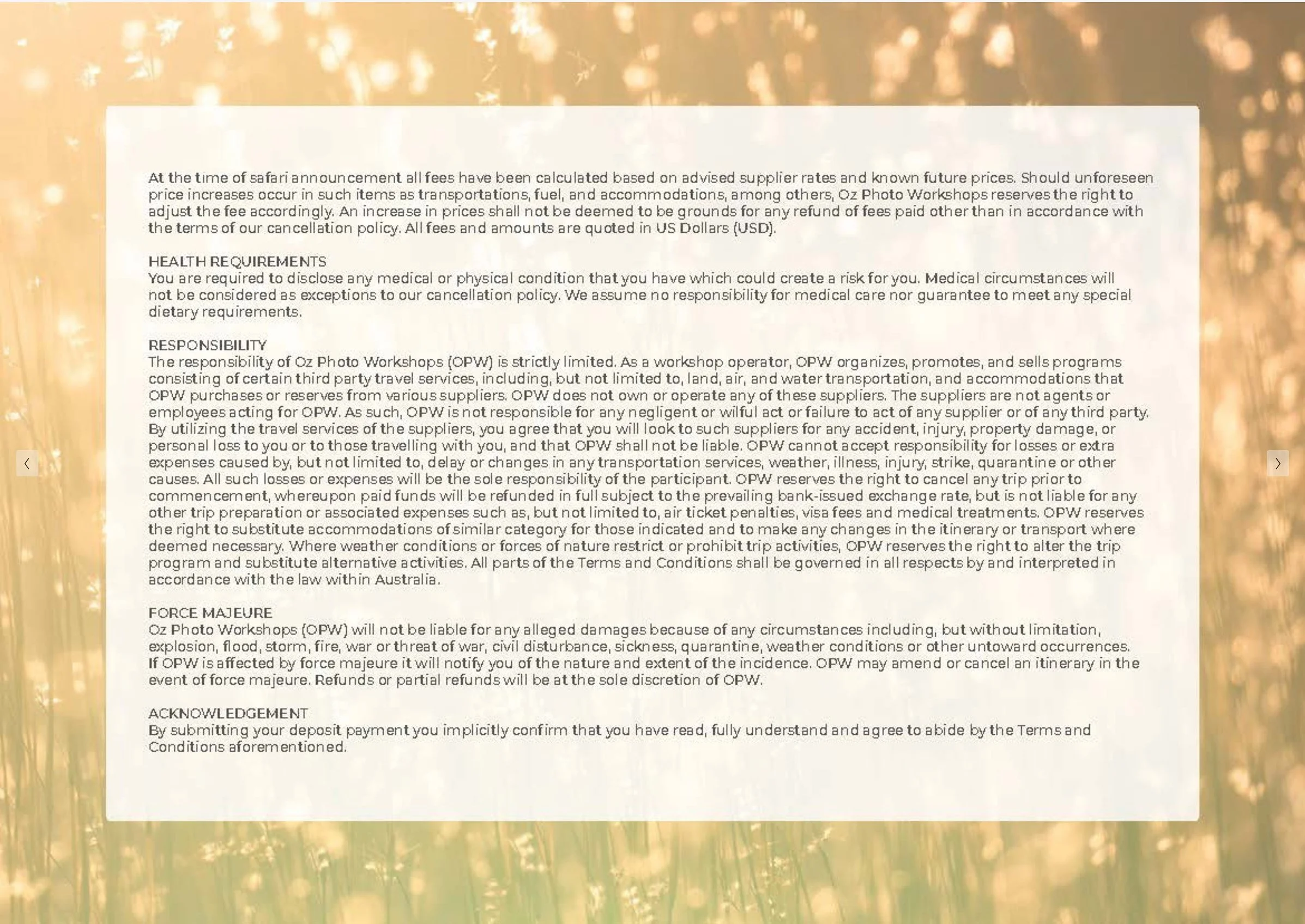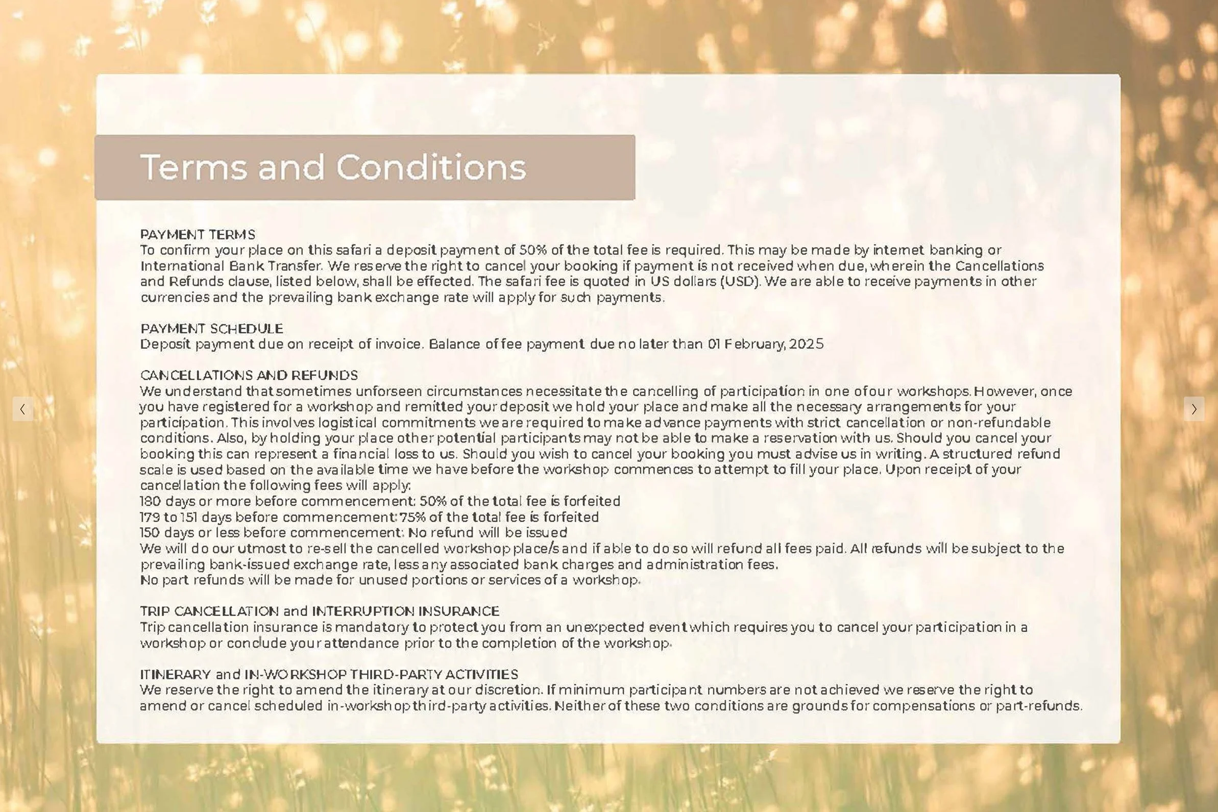 • Tips/Gratuities - note: it is customary to tip the native guide and spotter for each game drive; this can also be done at the end of the week.